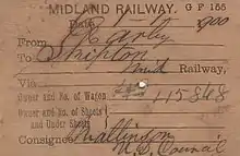 Midland Railway wagon card for a consignment from Earby to Skipton
