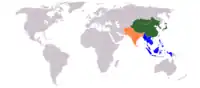 East Asia is highlighted in green on this map, which also includes Southeast Asia (blue) and South Asia (orange).