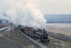 Mikado locomotives provided the primary motive power of the East Broad Top's narrow gauge mainline from their initial deliver in the early 1910s until the railroad's abandonment in the 1950s. Predating the purchase of any Mikado engines, the East Broad Top had purchased a 2-6-2 Prairie engine (#11) in 1908 whose success encouraged the railroad to go larger with the following Mikado locomotives.[1] The Mikado locomotives share several features to ensure smooth handling of heavy coal traffic, including double air brake pumps and two sand domes.[2] The railroad began installing airbrakes on their equipment in 1913 along with new steel cars to operate alongside the growing Mikado fleet.[3] Although the East Broad Top did briefly consider replacing the Mikado fleet with diesels, the line's abandonment and sale to Nick Kovalchick saved the historic steam locomotives with all six locomotives still preserved at the original East Broad Top's Rockhill Furnace shops.[4][5][6]
