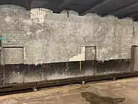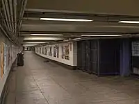 The unused space runs for no more than 15 feet (4.6 m) before ending at a solid wall. Another door that leads to the electrical room hides the eastbound trackway. Near the north end of this station, a different ceiling structure angling across marks where the unbuilt subway would have gone.[22] The ramp that descends from the full-time side would have led to the same intermediate level, with a station facility in between, but that was never constructed. On the open intermediate level's mezzanine, the unusual spacing of some of the pillars marks where the line's platforms would have been placed.[23][24]