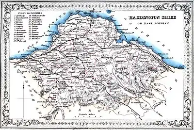 Haddingtonshire has ancient origins and is named in a charter of 1139 as Hadintunschira[1] and in another of 1141 as Hadintunshire.[2] Three of the county's towns were designated as royal burghs: Haddington, Dunbar, and North Berwick.