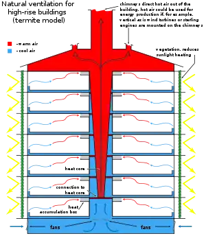 • Evening: temperatures outside drop. The warm internal air is vented through chimneys, assisted by fans but also rising naturally because it is less dense, and drawing in denser cool air at the bottom of the building.