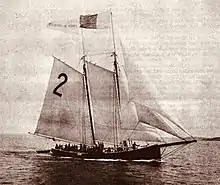Eben Jordan gave Captain Thomas Cooper a set of signal flags for use on his pilot-boat.[3] The boat was flying a blue and white pilot flag at the fore and a large white flag displaying her name along with the boat number “2” painted as a large number on her mainsail.
