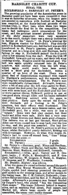 In 1891–92 Ecclefsield earned its greatest honour, winning the Barnsley Charity Cup - a trophy worth some £90[9] - by beating Barnsley St Peter's in the final.