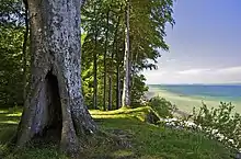 The shores of the bay are shaped by the tides and the surf as during high winds from the northeast and southwest, heavy sea might build up. When the water level is 0.75 m (2.5 ft) higher than usual, sand and gravel is being eroded from the cliff coast. In some places, the coastline recedes 15 to 20 cm (5.9 to 7.9 in) every year. As a result the hills of the Terminal moraines, that had formed during the last Ice Age in the southeast are hollowed out and a 30 m (98 ft) high and 3.6 km (2.2 mi) long cliff has formed in front of Altenhof. The steadily eroded material is partly deposited further west and has separated the Goossee from the Eckernförde Bay. Several sand banks run parallel to the beach. The banks are mainly forested with deciduous trees.[2][3]
