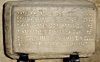 Urartian cuneiform script: "By the glory of God Ḫaldi, king Sarduri II, son of Argishti I, poured 10100 kapi of grain here.[2]