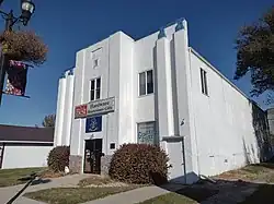 The Edinburg WPA Auditorium is a historic auditorium building at 67 Main Street in Edinburg, North Dakota. The Art Deco structure was built in 1938 as part of the Works Progress Administration jobs program. It is a wood-frame building two stories high, sheathed in boards to which a stucco finish has been applied. There is a central projecting section on the front facade. The upper level is a large open space which was usable for a variety of social and recreational activities, and features a well-preserved sprung wooden basketball surface, decorated with the names and logos of area high school basketball teams. The lower level was originally a utility space. The upper part of the building was originally accessed via external stairs, but these were removed in 1990, and the building's entrance was reconfigured to have split-level stairs providing access to both upper and lower levels.[2]