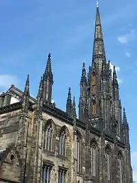 The 240-foot-high spire of The Hub, ticket office, information centre and performance venue of the Edinburgh International Festival, seen from Johnston Terrace