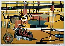 Casarella was hired by printmaker Anthony Velonis, who during the 1930s had led the Federal Arts Project in New York and expanded silk-screen printing as a fine art process.[2] Velonis was commissioned to write a pamphlet on this technique, Technical Problems of the Artist: Technique of the Silk Screen Process (1938), which was distributed to WPA art centers across the country. It was very influential in encouraging artists to try this process.[3] The New Deal program created employment opportunities for artists.