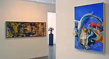 Since the 1920s, artists in English Canada had been heavily influenced by the landscape painting of the Group of Seven, the Canadian Group of Painters and the Eastern Group of Painters. In Quebec, John Goodwin Lyman founded The Contemporary Arts Society in 1939, promoting post-impressionist and fauvist art.[1] Paul-Émile Borduas and Jean-Paul Riopelle spearheaded the modernist collective known as Les Automatistes, which began having exhibitions as early as 1941. However, their artistic influence was not quickly felt in English Canada, or indeed much beyond Montreal.[2] The Painters Eleven (1953 - 1960) was founded in Toronto to promote their members' abstract works. Regina Five is the name given to five abstract painters, Kenneth Lochhead, Arthur McKay, Douglas Morton, Ted Godwin, and Ronald Bloore, who displayed their works in the 1961 National Gallery of Canada's exhibition "Five Painters from Regina". Though not an organized group per se, the name stuck with the 'members' and the artists would continue to show together.[1]