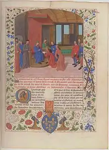 ![]() Edmund Beaufort (left) negotiating with French envoys at Rouen, from the Chronique of Jean Chartier, c. 1470–80 | |
