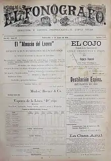 In 1879 López Rivas returned to Venezuela and founded in Maracaibo El Fonógrafo (The Phonograph), a newspaper mainly aimed to defend social welfare. This newspaper was also closed down several times by the government, but its moral prestige made it possible for El Fonógrafo to restart, over and over, and to survive 38 years of censorship and dictatorship.[4]