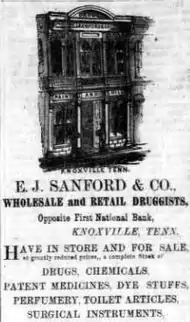 Toward the end of the war in 1864, Sanford formed a drug company, E.J. Sanford and Company.[1] In 1872 this company consolidated with a business established by Hiram Chamberlain and A.J. Albers to form Sanford, Chamberlain and Albers. In subsequent years, this company grew to become one of the largest pharmaceutical companies in the South.[3]
