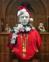 A bust of Edward Orton Sr. in the Orton Hall library at the Ohio State University, decorated to celebrate Christmas and the school football team's participation in the College Football Playoff