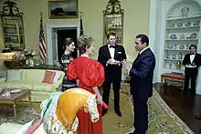 US President Ronald Reagan and Nancy Reagan meets Egyptian President Hosni Mubarak and Suzanne Mubarak at Mubarak's state visit to Washington, March 1982