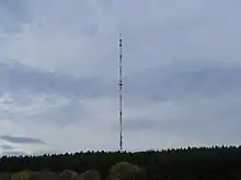 The Eifel Transmitter (German: Sender Eifel) is an FM and TV transmission facility for the German broadcasting company of SWR and is located on the Scharteberg near Kirchweiler, Germany. Until 1985, the Scharteberg transmitter used a 160 metre tall guyed mast. However this mast did not allow good reception in deep valleys, so in 1985 a new, 302 metre tall, guyed, steel framework mast was built, becoming the tallest structure of Rhineland-Palatinate. The elements of this mast were built by the firm of Hein, Lehmann AG, whilst construction work was carried out by BBS AG, Ludwigshafen. The first 20 metres of the mast were built using a small crane. The mast elements in heights between 20 and 100 metres were mounted by the aid of a car crane, while for the sections above a derrick crane was used. The new mast of Scharteberg transmitter consists of a 288 metre tall, guyed, lattice, steel structure with a square cross section, a side length of 2.1 metres and a 14 metre long GFK-cylinder on top for the UHF antenna. The total weight of the structure is 204 tons. The mast is guyed at 4 levels, 57, 123, 195 and 273 metres above ground. It is equipped with an elevator which runs up to a height of 281 metres. For aircraft warning 20 red neon lamps and two blinking lights with 1000 watt lamps are installed.