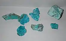 Eilat Stone (Hebrew: אבן אילת) is a gemstone that derives its name from the city of Eilat in Israel, where it was once mined. It is characterized by a green-blue heterogeneous mixture of several secondary copper minerals, including malachite, azurite, turquoise, pseudomalachite, and chrysocolla. Eilat stone is the national stone of Israel, and is also known as the King Solomon Stone.