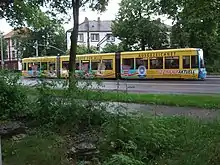 Tram in front of Kassel-Wilhelmshöhe station with advertising for EINKAUFAKTUELL