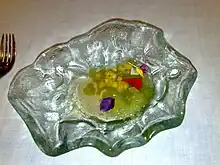 When diners first arrive, they are given a selection of small bites from a section of the kitchen called "El Món", who only produce small snack portions for the guests. They typically demonstrate flavours from around the world and come in sets of five. These introduce the diner to the unusual techniques and presentations of the restaurants. For example, a small ball of frozen spiced fish stock coated in cocoa butter represents Thailand, while the set comes on a purpose-built wooden holder.[13] While there are typical fine dining ingredients included on the menu such as lobster and foie gras, due to the Catalan influence on the menu, ingredients such as pigeon, hake and pig's trotters also appear.[14] Fish dishes include a crayfish velouté, accompanied by spring onions with cocoa and mint.[15]
