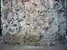 East Plaza Structure 1 is on the east side of the plaza.[20] In its final form it was a platform with two levels standing to a total height of 7 metres (23 ft).[73] It measured 20 metres (66 ft) north-south by 15 metres (49 ft) east-west.[73] The structure had a 2-metre (6.6 ft) wide stairway climbing from the plaza on the west side, the stairway was 10 metres (33 ft) long.[73] The lower level was the main platform. It was built from finely dressed limestone blocks.[73] The upper level was built of very poor quality limestone and is extremely badly preserved.[73] A bench was built on top of the structure. It measured 8 by 3 metres (26.2 by 9.8 ft) with a protruding section measuring 3 by 5 metres (9.8 by 16.4 ft).[74] The bench was 25 centimetres (9.8 in) high.[74] A large number of flint chippings were excavated from the structure. They have been dated to the Late Classic.[74]