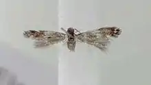 The wingspan is 7–9 millimetres (0.28–0.35 in)[2] The head is grey, face white. Forewings are grey, irrorated with dark fuscous ; a central fascia not reaching dorsum, a spot on tornus, and another on costa close before apex whitish ; a black apical dot. Hindwings are dark grey.The larva is whitish, sides more yellowish ; subdorsal series of red spots ; head dark brown ; 2 with two brown spots.[3]