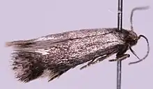 The wingspan is 9–10 millimetres (0.35–0.39 in). Adults are on wing from May to July. There are two generations per year.The head is grey, face whitish. Forewings light grey irrorated with dark fuscous ; a very indistinct oblique whitish fascia before middle, usually partly or wholly obsolete ; a small tornal spot and larger triangular spot on costa somewhat beyond it ochreous-white.Hindwings are grey..[1]