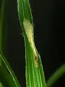 The larvae feed on greater wood-rush (Luzula sylvatica) mining the leaves of their host plant. Young larvae create a very narrow mine running parallel to the midrib. The mine then suddenly widens to almost the full width of the leaf. The frass is deposited in the transition area between the mine types. Pupation takes place outside of the mine.[3] They are greenish black with a pale honey coloured head. Larvae can be found from autumn to mid-June of the following year.