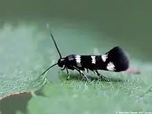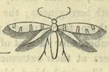 The wingspan is about 8 millimetres (0.31 in). Adults are on wing in July in one generation per year.[2]