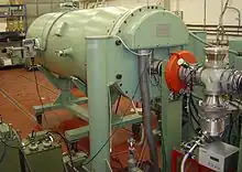 Now that the vapor of the desired has been ionized, they must be removed from the magnetic bottle. To do this, a high voltage is between the hexapoles applied to pull out the ions from the magnetic field.[18] The extraction of the ions, from the chamber, is carried out using an electrode system through a hole in a positively biased plasma chamber.[18] Once the ions have been extracted from the chamber, they are then sent to the cyclotron for acceleration. It is very important that the ion source used is optimal for the experiment being carried out. To perform an experiment in a practical amount of time, the ions provided from the accelerator complex should have the correct desired energy.[18] The quality and stability of the ion beam needs to be considered carefully, due to the fact that only the ions with the correct flight trajectory can be injected in the cyclotron and accelerated to the desired energy.[18]