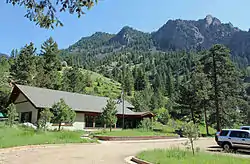 The park's ranger station and visitors' center, with Shirttail Peak in the background.