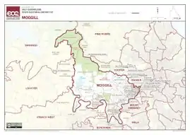 The electoral district of Moggill was created in the 1986 redistribution combining part of the electoral district of Mount Coot-tha with parts of the electoral district of Ipswich West. In 1991, a small portion east of the Centenary Highway was removed.[1]