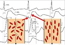 Prior to opening of the aortic valve, the red blood cells (erythrocytes) assume a random orientation (there is no blood flow in the aorta). When the electric current is applied from the outer electrodes, the current must circumference these red blood cells, therefore resulting in a higher voltage measurement, and thus, a lower conductivity. Shortly after aortic valve opening, the pulsatile blood flow forces the red blood cells to align in parallel with the blood flow. When the electric current is then applied, it is able to easily pass the red blood cells in the aorta resulting in a lower voltage, and thus, a higher conductivity. The change from random orientation to alignment of red blood cells upon opening of aortic valve generates a characteristic steep increase of conductivity or dZ(t) (corresponding to a steep decrease of impedance) – beat to beat.[3]