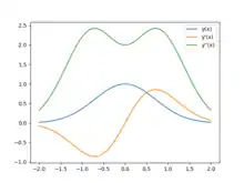 A simple gaussian wave with its 1st and 2nd derivative. As you take a higher order derivative the peak gets more pronounced since the peak gets narrower.