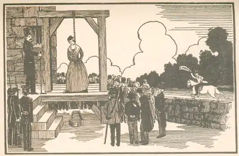 Several old illustrations of Elizabeth Wilson's hanging show a scaffold and gallows, but at that time such structures were not in widespread use. Rather, the condemned were "swung off." They were placed atop a ladder or cart (the latter being the case in Chester); one end of the rope was tied most likely to a convenient tree branch and the other, of course, placed around the victim's neck; the condemned was then pushed from his perch, or the support was quickly pulled from beneath him. Executions in this manner were often protracted, gruesome affairs, resulting in a slow death by asphyxiation rather than a quickly-broken neck, and hanging was considered (as it has been throughout history) one of the most shameful methods of capital punishment.[15][24][25] While the execution of women has always been relatively uncommon, there were many instances in this period of women who were hanged for the murders of their "bastard children."[15]
