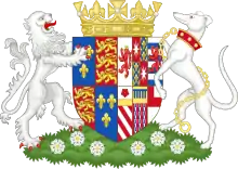 Elizabeth Woodville was born in about 1437 (no record of her birth survives), at Grafton Regis, Northamptonshire. She was the firstborn child of a socially unequal marriage between Richard Woodville, 1st Earl Rivers, and Jacquetta of Luxembourg, which briefly scandalised the English court. The Woodvilles, though an old and respectable family, were gentry rather than noble, a landed and wealthy family that had previously produced commissioners of the peace, sheriffs, and MPs, rather than peers of the realm. Elizabeth's mother, in contrast, was the eldest daughter of Peter I of Luxembourg, Count of Saint-Pol, Conversano and Brienne, and as the widow of John of Lancaster, Duke of Bedford, uncle of King Henry VI of England, was before her second marriage one of the highest ranking women in England.[6] As Jacquetta had pledged, upon the death of her first husband, that she would not remarry without first obtaining royal permission, and as royal permission to marry Woodville was out of the question, the pair married secretly. When the marriage became public knowledge, the couple was heavily fined, but was pardoned on 24 October 1437: it has been conjectured that the pardon coincided with the birth of Elizabeth, the couple's firstborn child.[7][8]
