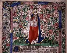 One of only three lyric poems in Middle English ascribed to a woman author,[35] alongside "An Anchoress' Hymn to the Virgin" and "Eleanor Percy's Prayer", "My heart is set upon a lusty pin"[36] is attributed to one "Queen Elizabeth", sometimes thought to have been Elizabeth Woodville (although the author is also argued[36][37] to have been her daughter, Elizabeth of York). This hymn to Venus, found in one single manuscript,[38] is a complex six-stanza poem[39] with rhyme scheme ABABBAA, an "elaboration of the sestina,"[40] in which the seventh line of each stanza is the same as its first, and the six unique lines of the first stanza provide the first lines for each of the poem's six stanzas.
