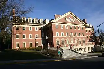 The Elmina White Honors Hall, also known as Honors Hall is a residence hall located on the main campus of Washington State University in Pullman, Washington. It was designed by Stanley Smith, the head of the architecture department at Washington State University (1924-1947), and was completed in 1928. It was later remodeled into student housing and faculty offices in 2001, costing $15.3 million.[1] It is located in the northwest corner of Washington State University (WSU) in Pullman, Washington. Its original purpose was to house the Home Economics department as part of the College of Domestic Economy. Following the 2001 reconstruction, the four-story building, with a converted basement, was transformed into three floors of residential suites with classrooms, offices, and a library for the WSU Honors College on the ground floor, and several multi-purpose rooms in the basement.[2] It was designed in a Georgian Revival style and was referred to as an “elegant architectural statement” in a report provided by the Washington State University Task Force for Historic Preservation in 1985.