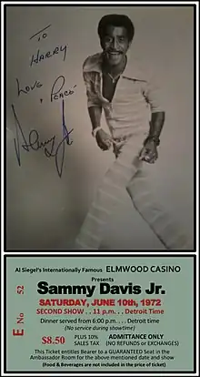 Sammy Davis Jr. performed at the Elmwood several times during his career. Whenever he did, he would rent out the entire sixth floor at the historic Gotham Hotel, as was mentioned in Earnest H. Borden's book Detroit’s Paradise Valley. BlackPast mentioned in an article that Davis was on Gotham's guest list of prominent African Americans.[14] The Gotham was known as a safe and upscale hotel for African Americans.[15] The last hit Sammy Davis Jr. ever had was the song Hello Detroit.[16]