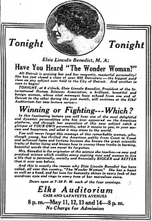 Elsie Lincoln (Vandegrift) Benedict (1885–1970), also known as 'The Wonder Woman',[1][2] was advertised as the world's best known lecturer[3][4][5] during the 1920s and 1930's, speaking to over 3 million people in her lifetime and writing on what Napoleon Hill and Dale Carnegie and a long list of men would do later. Renowned for her collegiate debate skills, emerged as a key figure in the national suffrage movement being personally recruited by Carrie Chapman Catt for national suffrage advocacy as the second-highest paid American suffragist leader. She would later take to the worldwide stage promoting the law of attraction through her many free and paid lecture series. She was the founder of Brainology, a famous course on scientific mind training.[6]