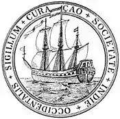 Before 1964, the coats of arms of the Netherlands, and later, the Netherlands Antilles were used on Curaçao, as it did not have a coat of arms of its own. As an alternative, a modified version of the seal of the Dutch West India Company (WIC) was adopted in 1795 as the seal of Curaçao.[6] It featured a sailing ship surrounded by the text: Sigillum Curaçao Societate Indie Occidentalis.[6]