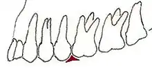 Diagram showing embrasure (red triangle) between maxillary right second bicuspid and maxillary right first molar. Right lateral view.