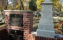 Warmiński's remains carried back to Bromberg by train on 12 June 1909. His funeral took place the following day, a Sunday; the ceremony was attended by a large crowd of Bydgoszcz residents. From the Nowofarny cemetery chapel, the procession went along several streets of the city to Starofarny cemetery: at the grave, his choir "Halka" chanted the four-voice song "Na groby" (On the grave).[6] Emil Warmiński was buried in the family vault in the Starofarny cemetery at 15 Grunwaldzka street.[7] Following his death, the editorial office of the "Dziennik Bydgoski" recalled the figure and merits of the honorable doctor of "Polish hearts and souls".[3]