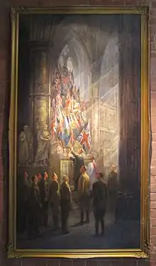 National Gallery of Canada purchased her oil painting Placing the Canadian Colours on Wolfe's Monument in Westminster Abbey, an oil 19 × 37". In 1921 she was commissioned by Sir Robert Borden to come to Canada to complete two large canvasses 6'6" × 11'6", oil painting entitled Canada's Tribute, The Great War 1914–1919 and Placing the Canadian Colours on Wolfe's Monument in Westminster Abbey.[1] The Canada Tribute paintings were initially hung in the Parliament Buildings but have been hung in the Sir Arthur Currie Memorial Hall of the Royal Military College of Canada in Kingston, Ontario since 1947.