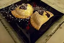 El Salvador is one of few countries where the empanada is made with plantain rather than a flour-based dough wrapping.[22] A popular sweet variation, empanadas de platano are torpedo-shaped dumplings of dough made from very ripe plantains, filled with vanilla custard, fried, then rolled in sugar.[23] They may alternatively have a filling made from refried beans rather than milk-based custard, but the flavour profile remains sweet rather than savoury.[24][25]