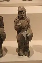 Lou Zhaojun, 501-562, was the principal wife of Gao Huan, 496-547; their son Emperor Wenxuan (Gao Yang, 526-559; r. 550-559) was the founding emperor of Northern Qi. While neither was appointed emperor or empress during their lifetime, as the de facto founder of the Northern Qi dynasty Gao Huan was posthumously titled Emperor Shenwu of Northern Qi and Lou Zhaojun was posthumously title Empress Ming of Northern Qi.. . . Lou Zhaojun was from a wealthy Xianbei family that had served as officials under the Former Yan dynasty (located in the area of present-day Chaoyang in Liaoning Province). Her clan had Sinicized its name to Lou toward the end of the fifth century. Gao Huan, on the other hand, was from a Han-Chinese family from Bohai (present-day Hebei Province); they had lived for several generations in the area that is now Inner Mongolia and had consequently adopted a largely Xianbei way of life. Despite Gao Huan's lack of means and low social status, Lou Zhaojun is said to have set her heart on him almost from the moment she saw him. She dispatched a maid to tell him of her interest and to give him some money; then she married him, against the wishes of her parents.