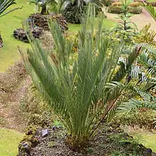 It is a cycad with an arborescent habit, with an erect or decumbent stem, up to 10 m (33 ft) tall and 35–45 cm (14–18 in) in diameter, often with secondary stems originating from basal suckers. The leaves, pinnate, arranged in a crown at the apex of the stem, are 1.2–1.5 m (3 ft 11 in – 4 ft 11 in) long, supported by a 30–40 cm (12–16 in) long petiole with a densely tomentose base, and composed of numerous pairs of lanceolate, leathery leaflets, up to 20 cm (7.9 in) long, with entire margin or occasionally with a single spine on the inferior margin and sharp apex.