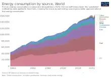 The second discourse was most broadly described by Jean-Baptiste Fressoz.[24] It emphasises that the term "energy transition" was first used by politicians, not historians, to describe a goal to achieve in the future – not as a concept to analyse past trends. When looking at the sheer amount of energy being used by humankind, the picture is one of ever-increasing consumption of all the main energy sources available to humankind.[25] For instance, the increased use of coal in the 19th century did not replace wood consumption, indeed more wood was burned. Another example is the deployment of passenger cars in the 20th century. This evolution triggered an increase in both oil consumption (to drive the car) and coal consumption (to make the steel needed for the car). In other words, according to this approach, humankind never performed a single energy transition in its history but performed several energy additions.
