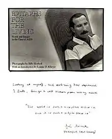 Epitaphs for the Living: Words and Images in the Time of AIDS is a book of photographs by Billy Howard, published in 1989 by Southern Methodist University Press in Dallas. The photographs are mostly portraits and depict persons infected with AIDS. Underneath each picture is a copy of a handwritten message by the subject, either telling an abbreviated version of the story of their illness or expressing thanks to the family and friends who have stood by them. An introduction of printed text analyzes the social issues discussed by the patients and highlights some of their more poetic lines.