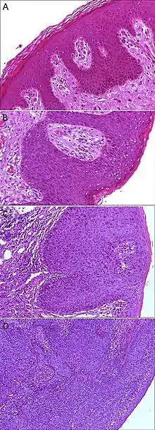 Epithelial cell dysplasia is divided into three categories of severity: mild, moderate, and severe. Epithelial dysplasia becomes microinvasive squamous cell carcinoma once the tumor begins to invade nearby tissue.
