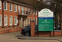 In the early years of the new millennium civic leaders decided to relocate various council departments that had been accommodated around the borough into an expanded town hall facility: a new block was constructed to the east of the main building with a modern atrium and new portico which linked the two blocks: the expanded facility was brought into use in 2003.[12] In a small ceremony at the town hall in June 2019, Station-Sergeant Thomas Green, the victim of the Epsom riot which took place at the end of First World War, was commemorated when his great-grandson, David Kirkham, donated Green's service medals so they could be put on display at the local museum.[13]